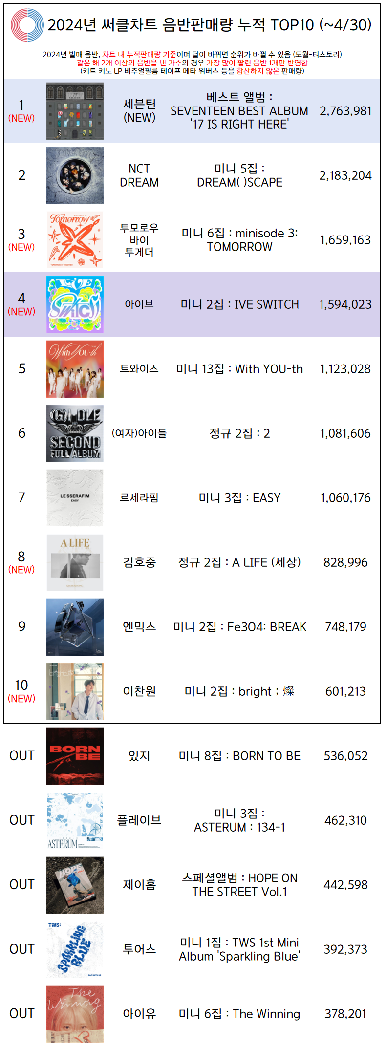 | 2024년 써클차트 영화방송게임&클래식 음반판매량 TOP5 (~4/30) (0) | 2024.05.17 |