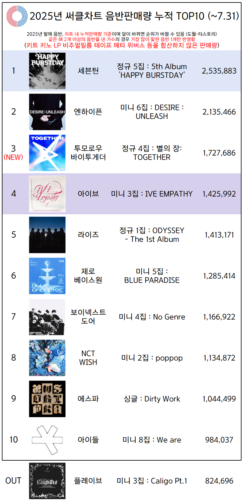 | 25년 7월 5주차 여가수 음반판매량 TOP5 (0) | 2025.08.12 |