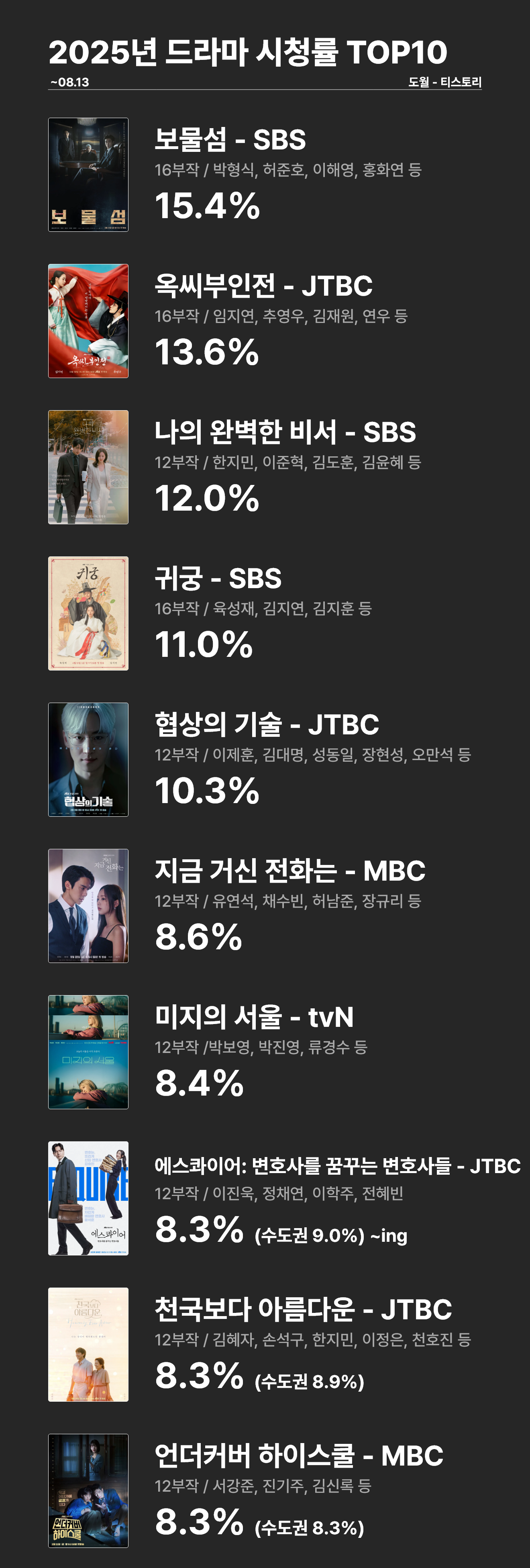 | 2025년 드라마 시청률 TOP10 (~09.08) (0) | 2025.09.08 |
