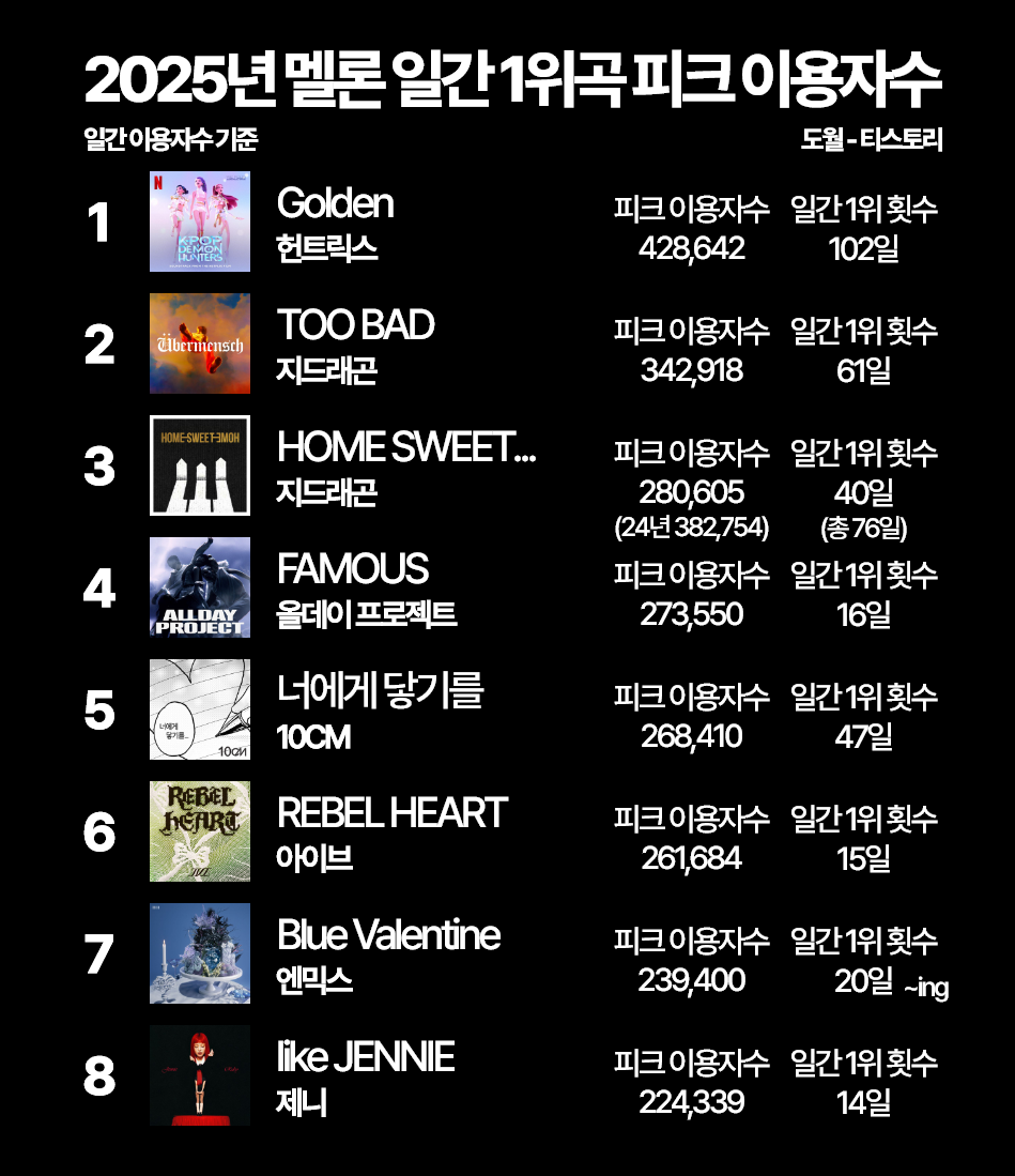 | 역대 멜론 주간 최장 기간 1위 곡 TOP5 (0) | 2025.11.15 |