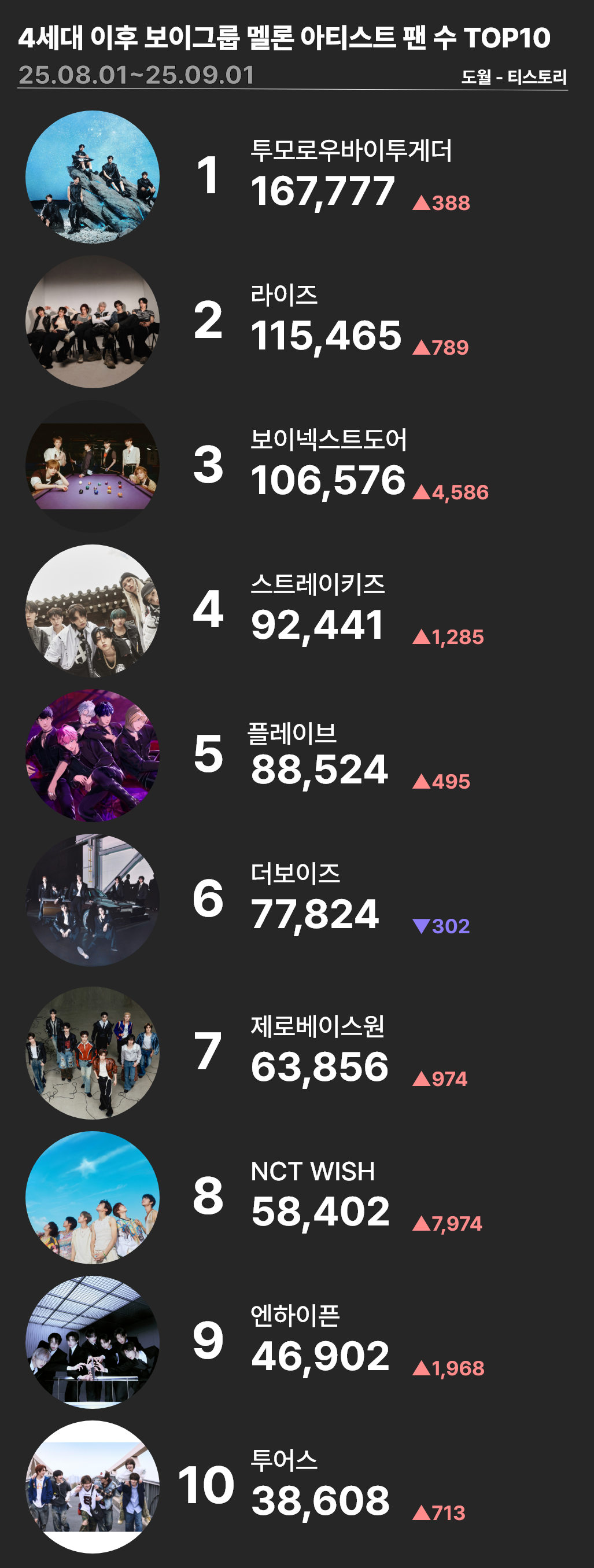 | 3.5세대 이후 걸그룹 멜론 아티스트 팬 수 TOP20 (~25.09.01) (0) | 2025.09.02 |