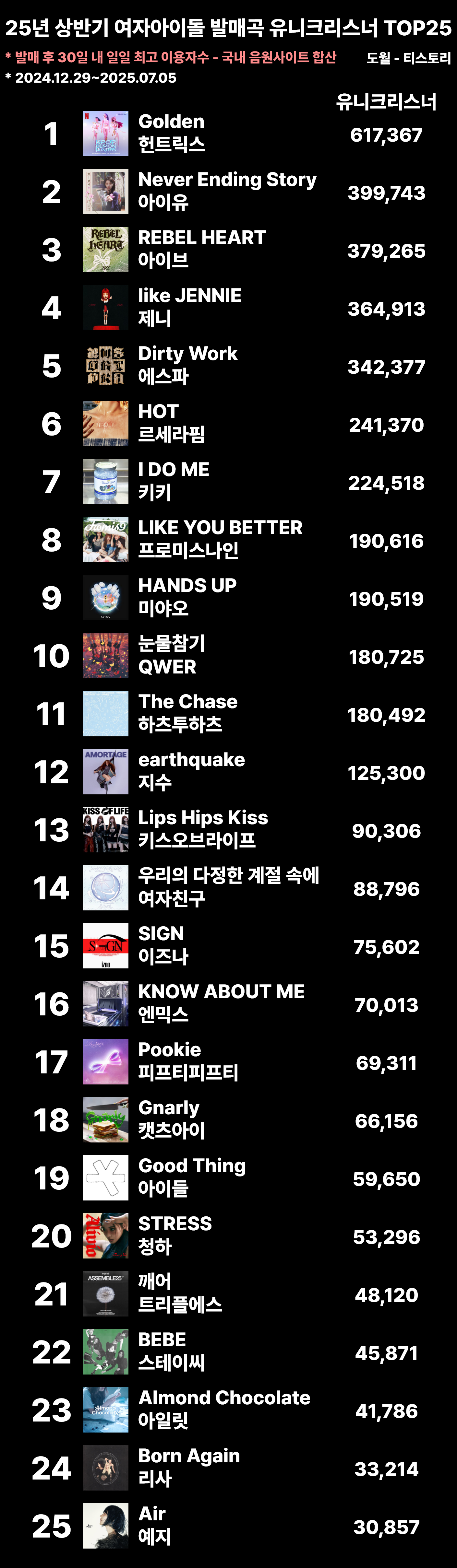 | 2025년 발매 후 멜론 24시간 이용자수 TOP20 (~09.07) (0) | 2025.09.07 |