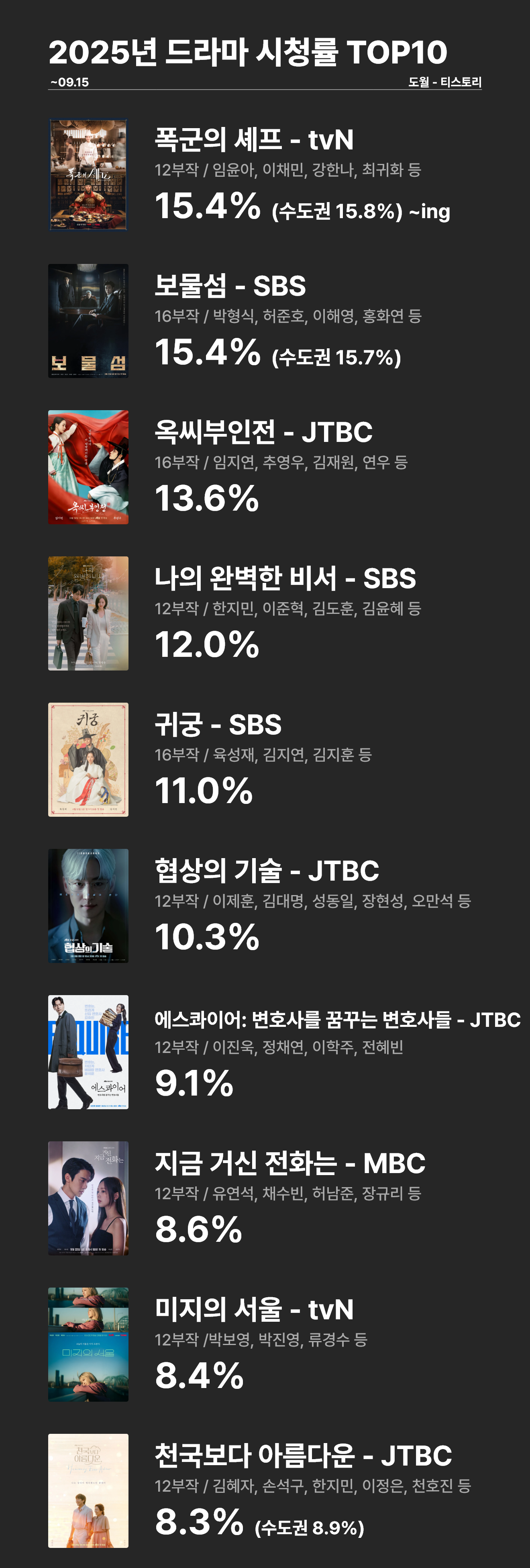 | 2025년 드라마 시청률 TOP10 (~09.30) (0) | 2025.09.30 |