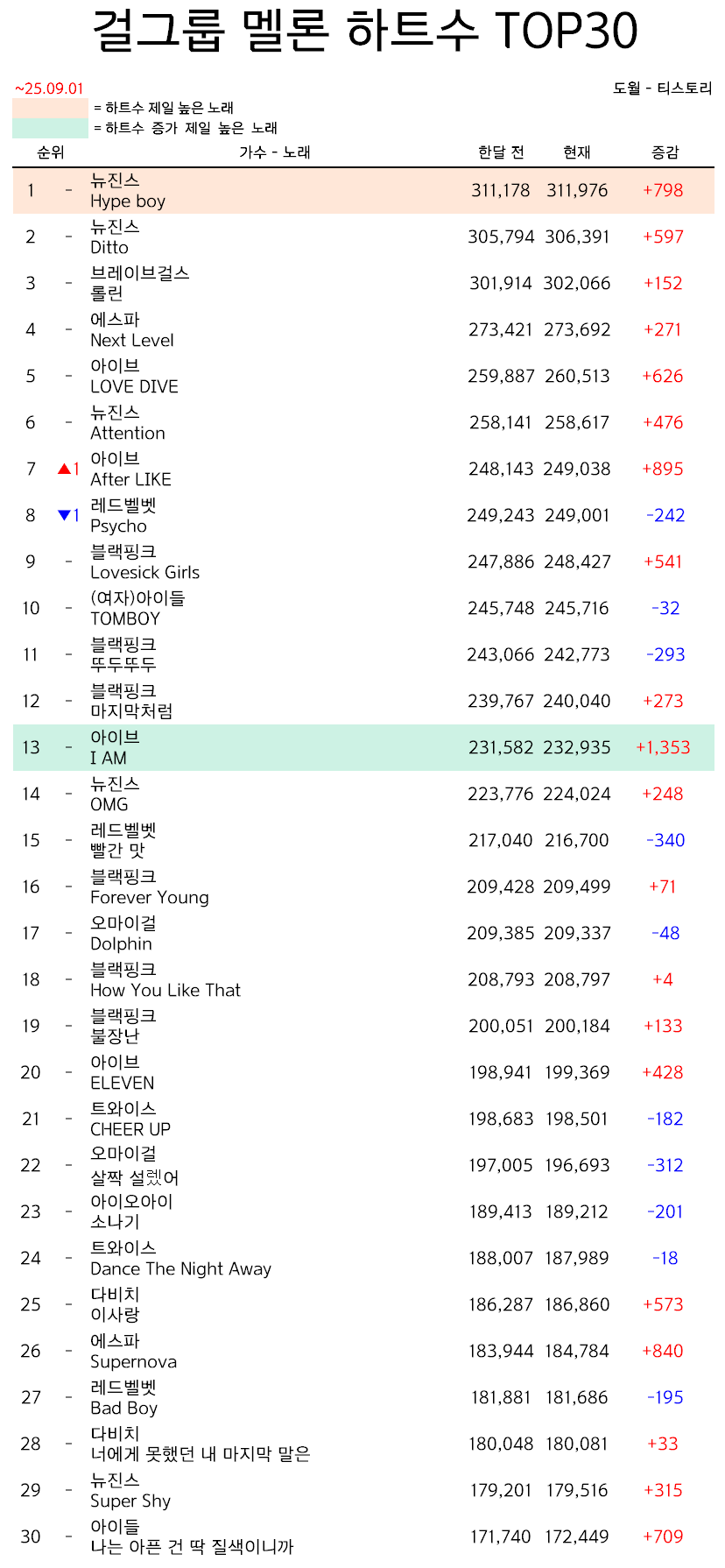 | 발매일별 멜론 하트수 제일 높은 곡 8월편 (0) | 2025.09.17 |
