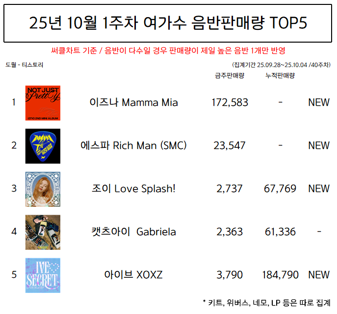 | 25년 10월 2주차 여가수 음반판매량 TOP5 (25년 41주차) (0) | 2025.11.12 |