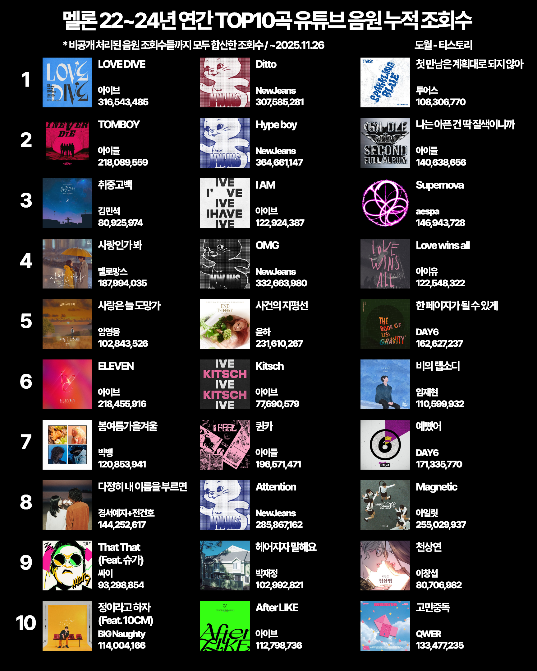 | 멜론 20~21년 연간 TOP10곡 유튜브 음원 누적 조회수 (0) | 2025.12.03 |
