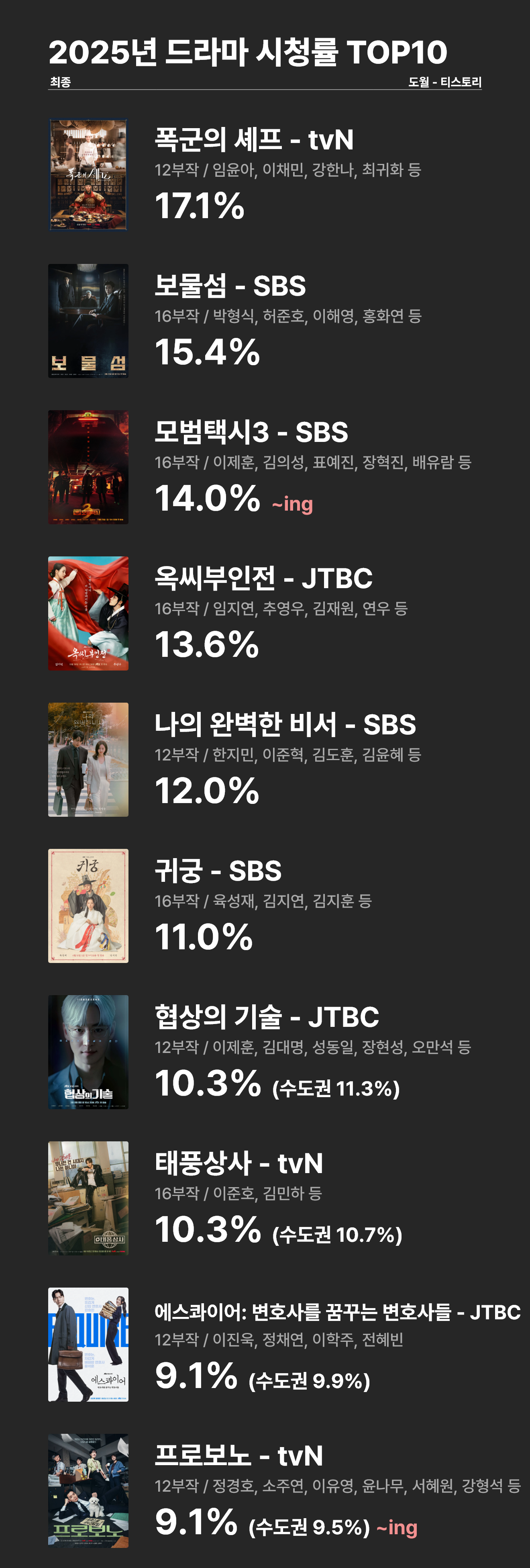 | 2025년 드라마 시청률 TOP10 (~12.16) (0) | 2025.12.16 |