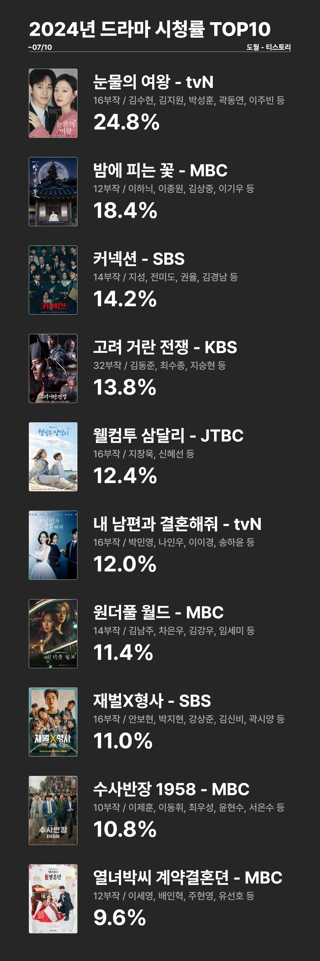 | 2024년 드라마 시청률 TOP10 (~8/30) (1) | 2024.08.30 |