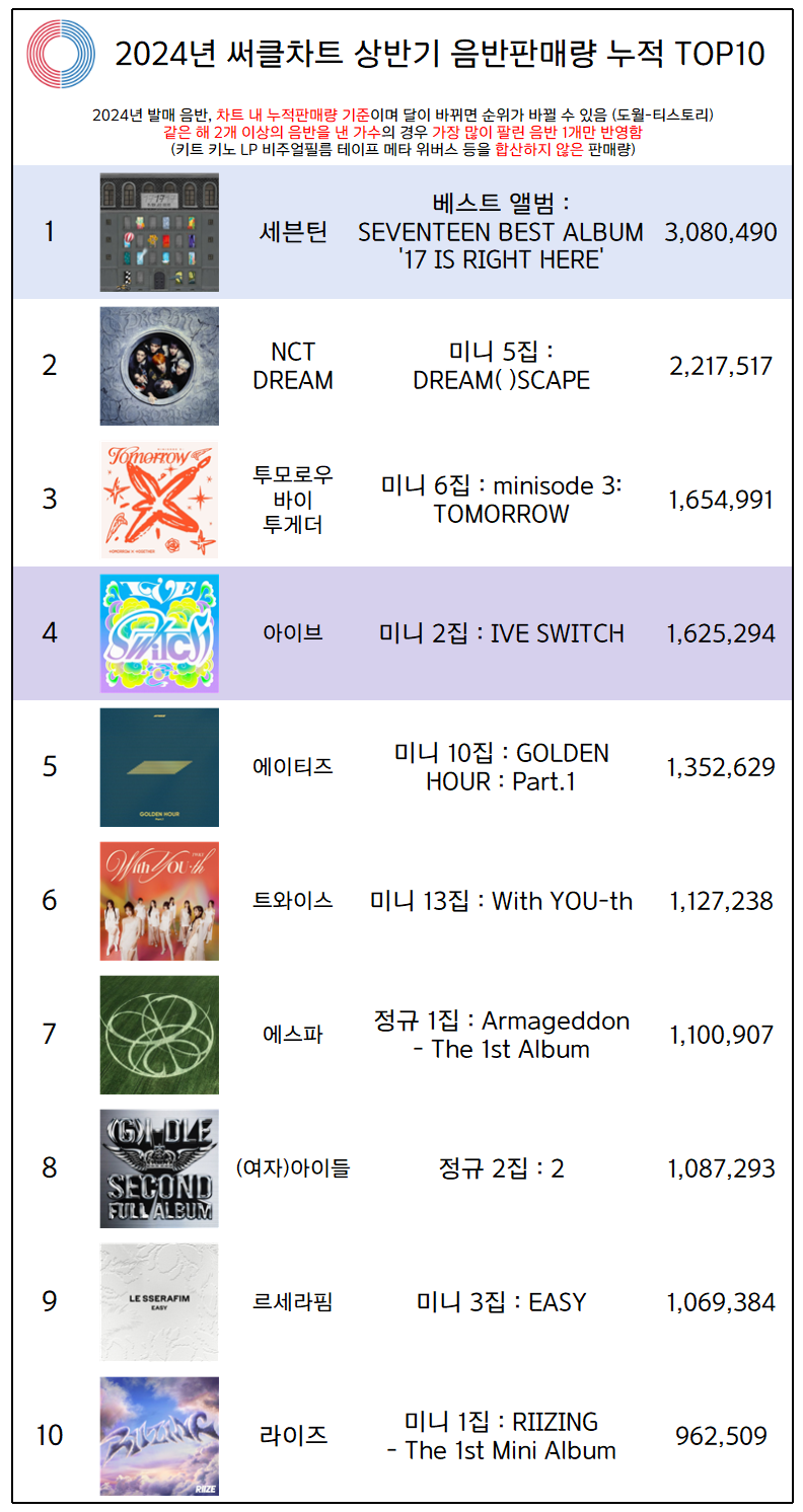 | 2024년 써클차트 영화방송게임&클래식 음반판매량 TOP5 (~6/30) (1) | 2024.07.16 |