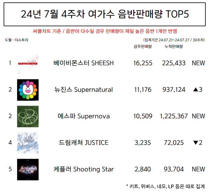 | 24년 7월 3주차 여가수 음반판매량 TOP5 (0) | 2024.08.01 |