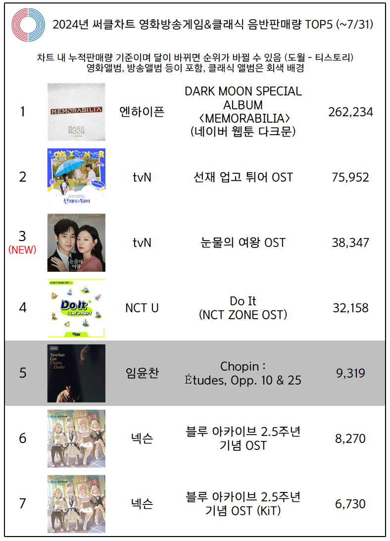 | 2024년 써클차트 음반판매량 누적 TOP10 (~7/31) (0) | 2024.08.18 |