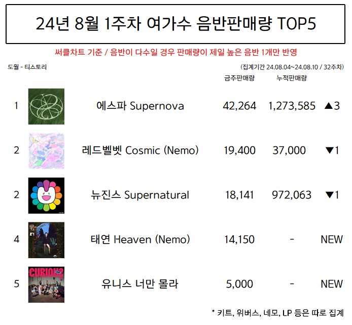 | 에스파 역대 앨범 써클차트 음반판매량 (0) | 2024.08.30 |
