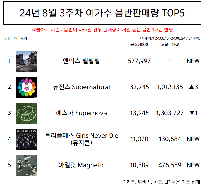 | 24년 8월 1주차 여가수 음반판매량 TOP5 (0) | 2024.08.30 |