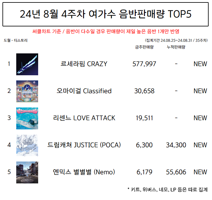 | 24년 8월 3주차 여가수 음반판매량 TOP5 (0) | 2024.09.01 |