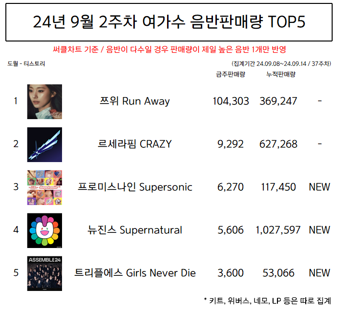 | 24년 9월 1주차 여가수 음반판매량 TOP5 (0) | 2024.09.19 |