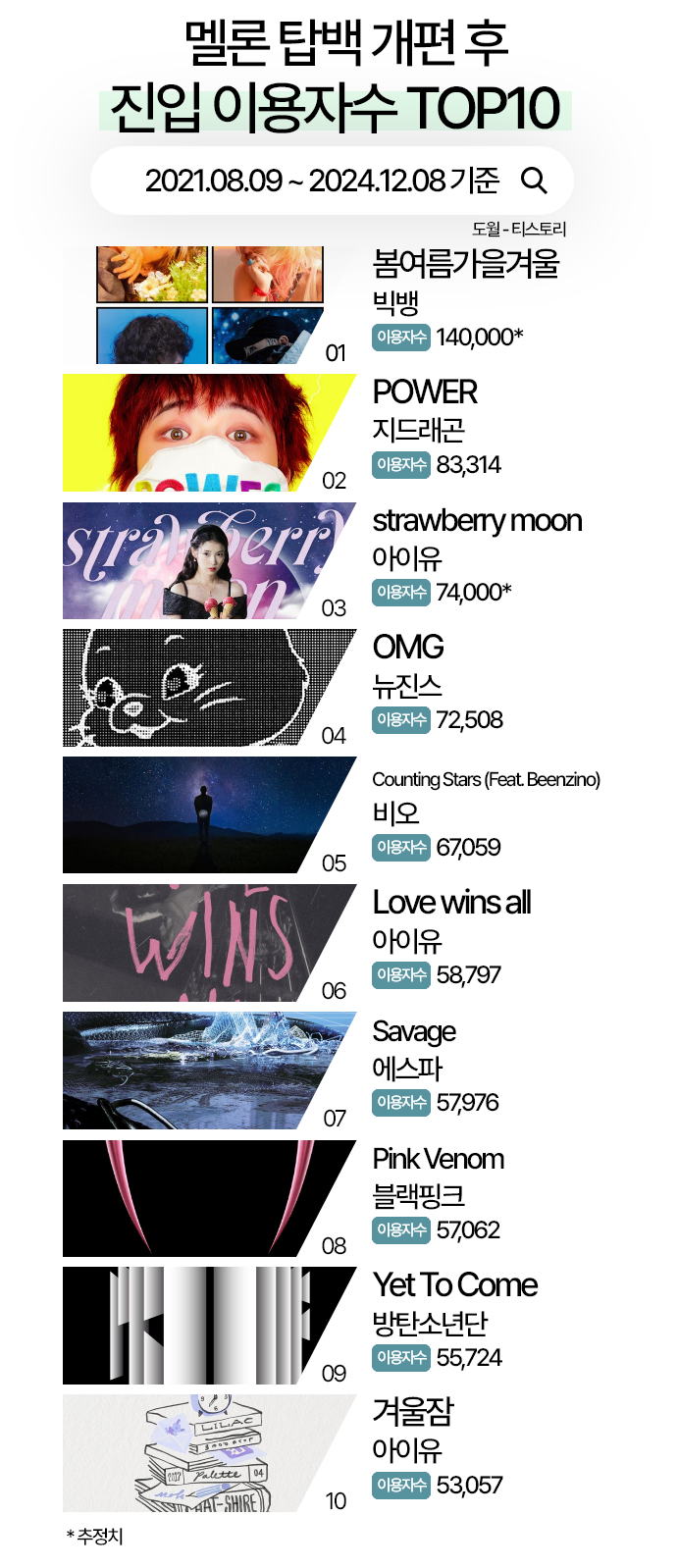| 아이돌 그룹 솔로 멜론 팬수 TOP10 (~24.12.01) (1) | 2024.12.02 |