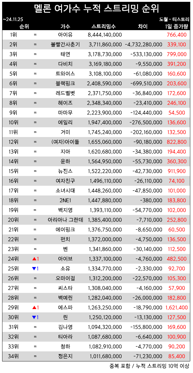 | 멜론 남가수 누적 스트리밍 순위 (~24.11.26) (0) | 2024.11.26 |