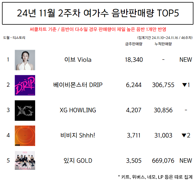 | 24년 11월 3주차 여가수 음반판매량 TOP5 (1) | 2024.12.08 |