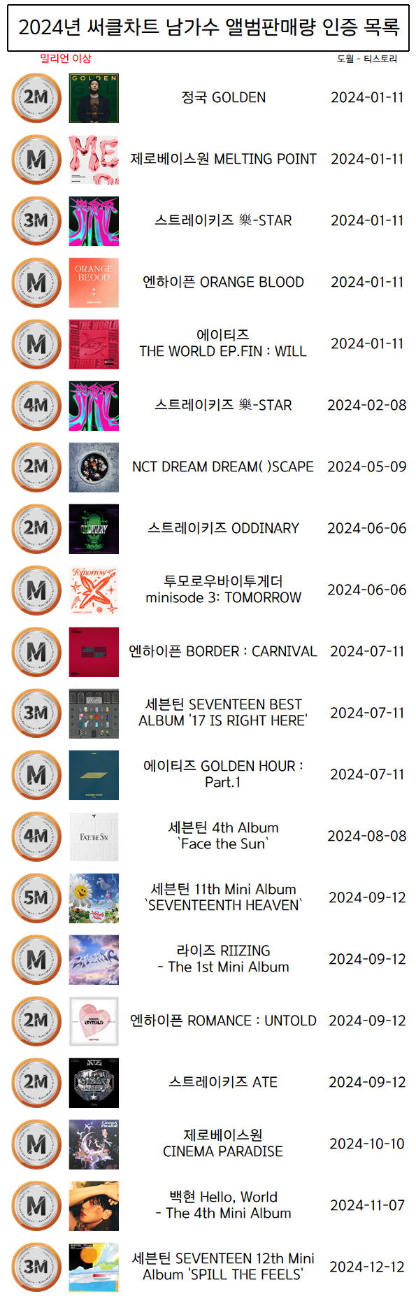 | 2024년 써클차트 여가수 앨범판매량 인증 목록 (12.12) (0) | 2024.12.24 |