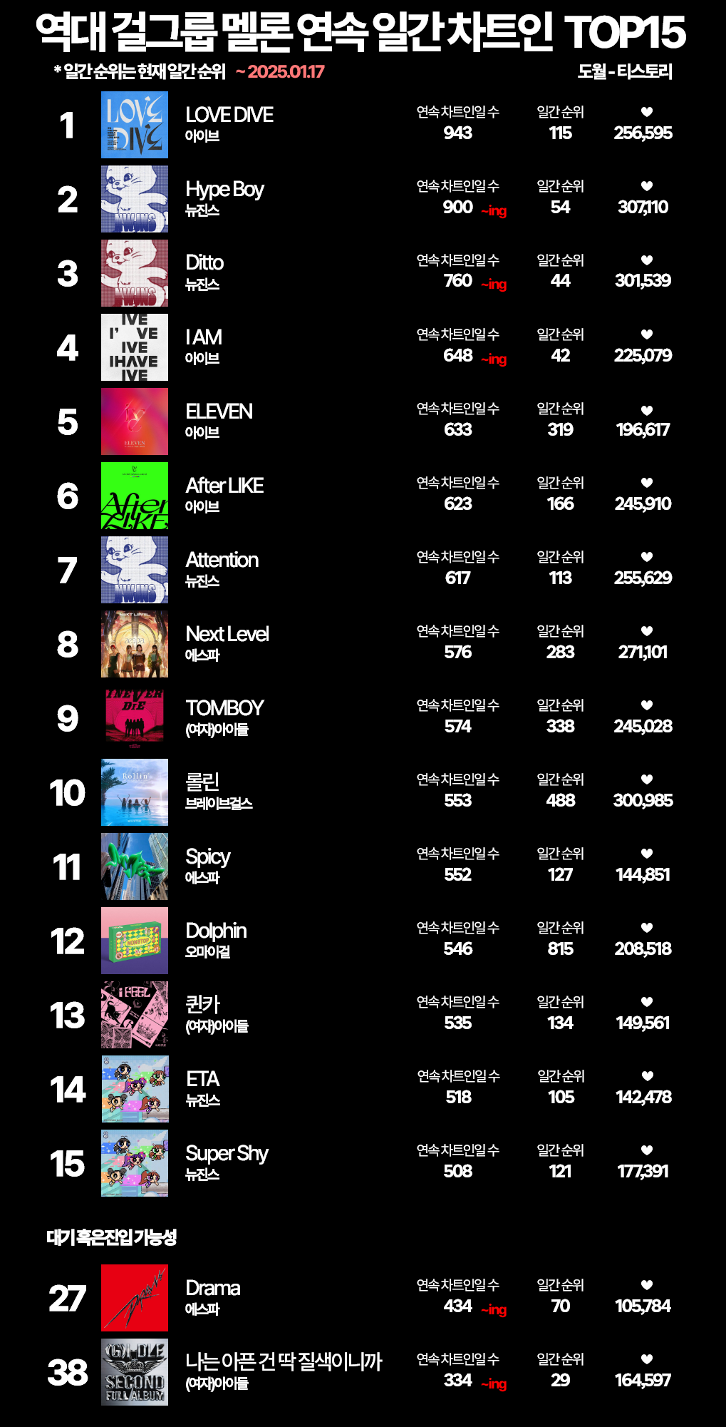 | 역대 멜론 주간 최장 기간 1위 곡 TOP5 (~25.01.20) (0) | 2025.01.20 |