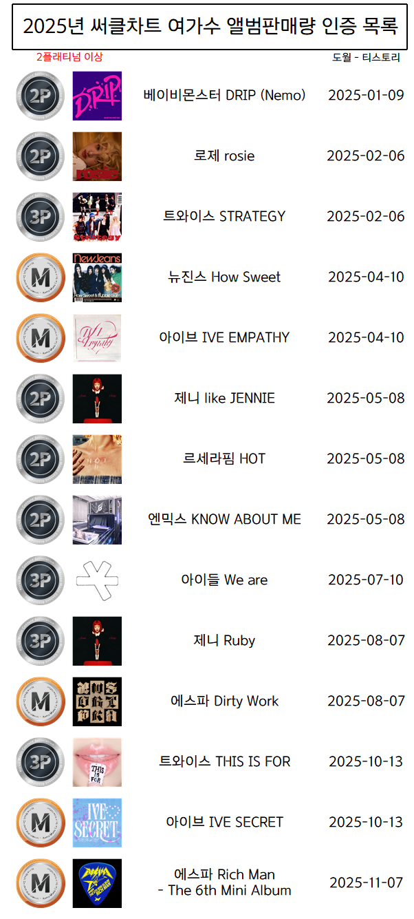 | 2025년 써클차트 남가수 앨범판매량 인증 목록 (11.07) (3) | 2025.11.30 |