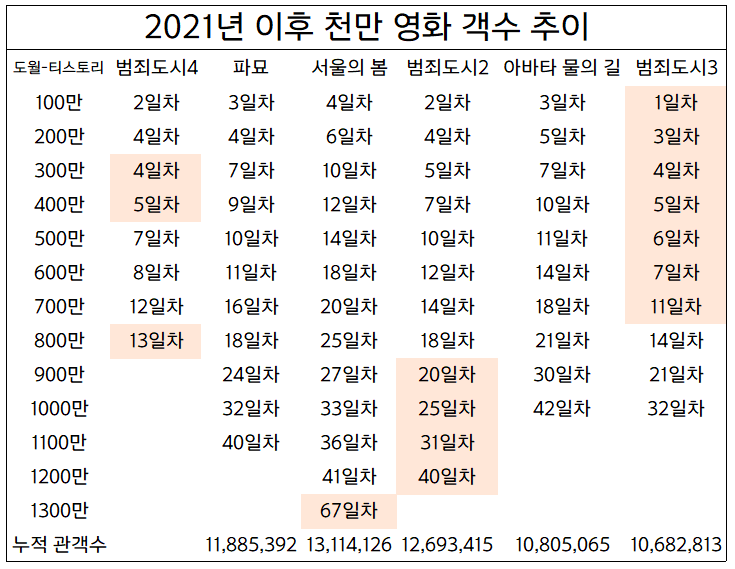 | 2021년 이후 천만 영화 관객수 추이 (범죄도시4 500만 돌파) (0) | 2024.05.01 |