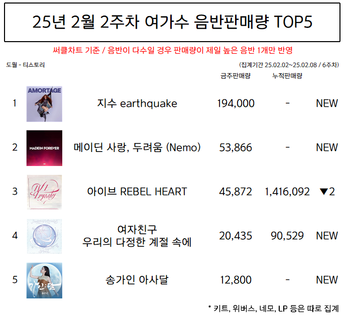 | 25년 2월 3주차 여가수 음반판매량 TOP5 (0) | 2025.03.01 |