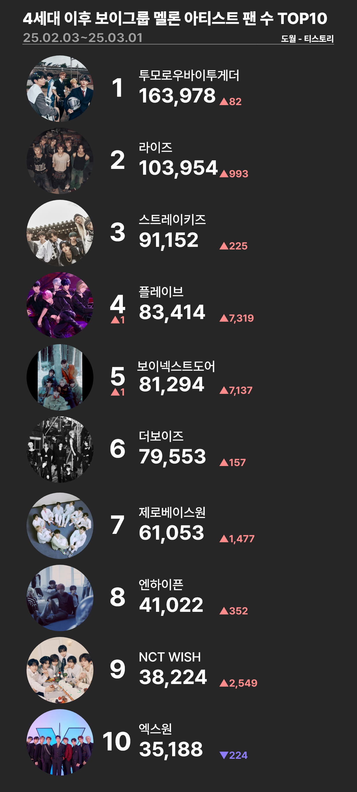 | 3.5세대 이후 걸그룹 멜론 아티스트 팬 수 TOP15 (~25.03.01) (0) | 2025.03.08 |