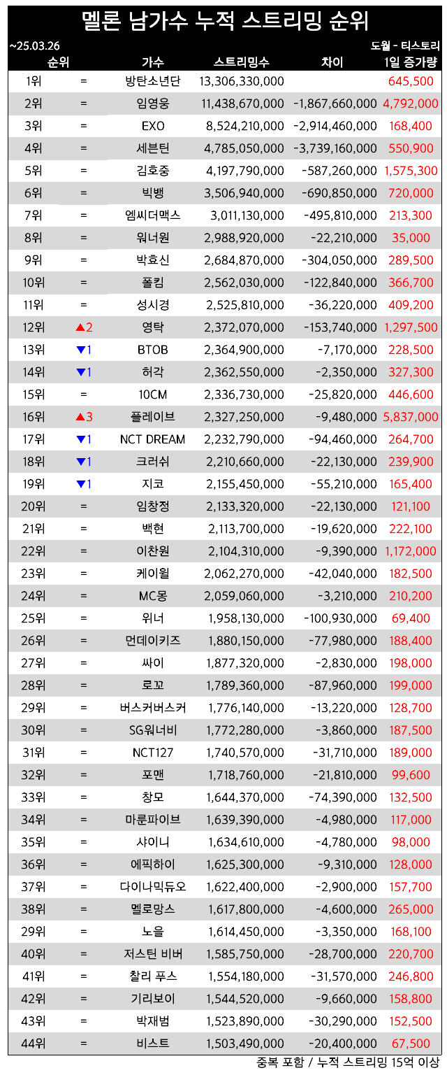 | 2025년 3월 멜론 하트수 유입 TOP10 (3) | 2025.04.03 |