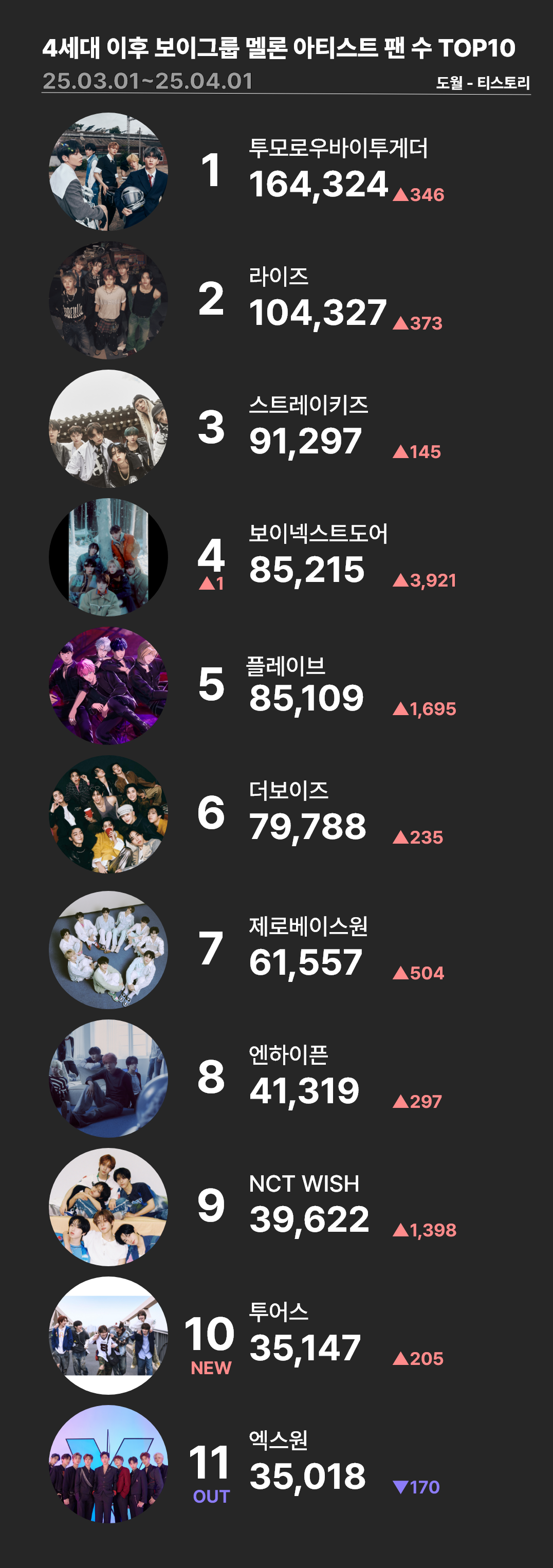 | 3.5세대 이후 걸그룹 멜론 아티스트 팬 수 TOP15 (~25.04.01) (1) | 2025.04.05 |