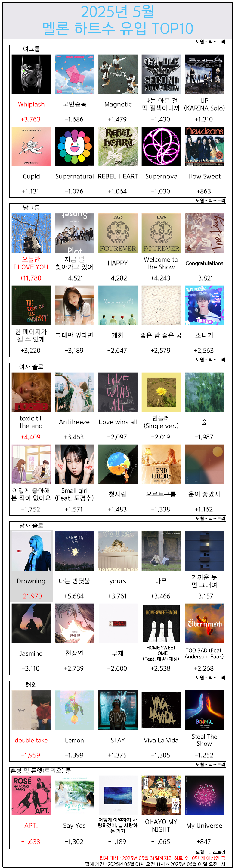 | 4~5세대 여자아이돌 그룹별 멜론 하트수 TOP3 (1) | 2025.05.30 |