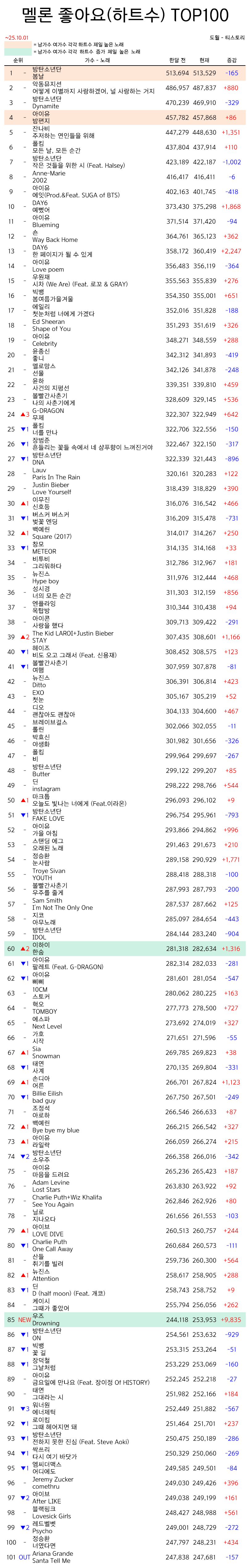 멜론 하트수 TOP100 25년 10월 #방탄소년단(BTS) #악동뮤지션 #악뮤(AKMU) #아이유(IU) #우즈(WOODZ) #조승연 #이하이(LeeHi) 음악/멜론 2025.10.22