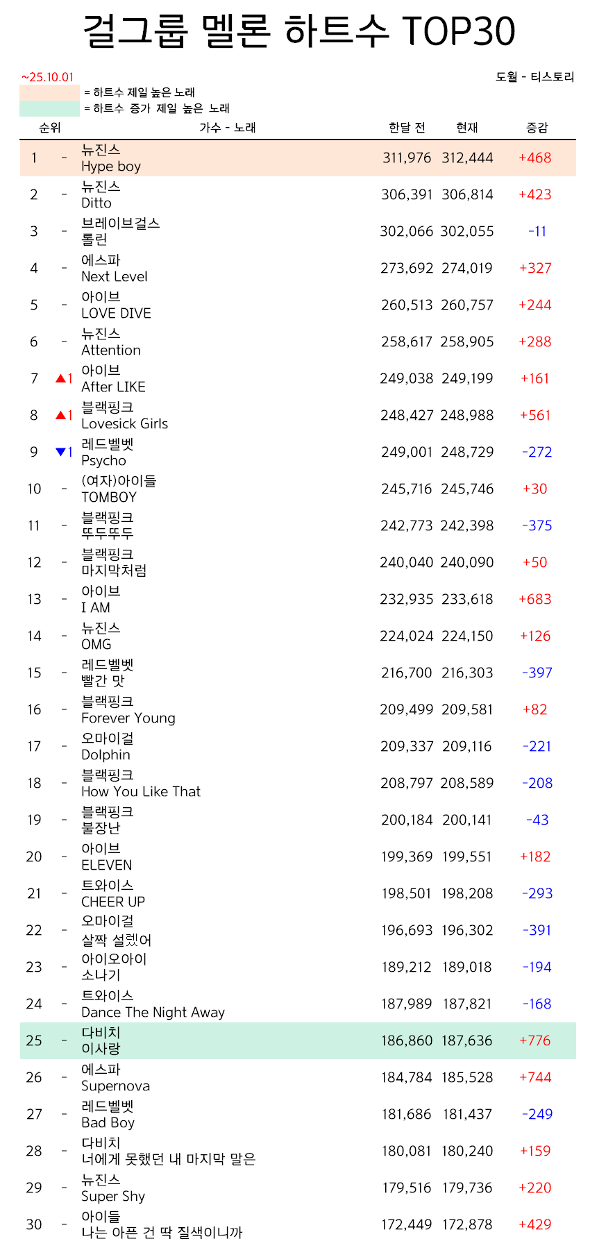 걸그룹 멜론 하트수 TOP30 25년 10월 #뉴진스(NewJeans) #브브걸(BBGIRLS) #아이브(IVE) #에스파(aespa) #블랙핑크(BLACKPINK) #다비치(DAVICHI) 음악/멜론 2025.10.28