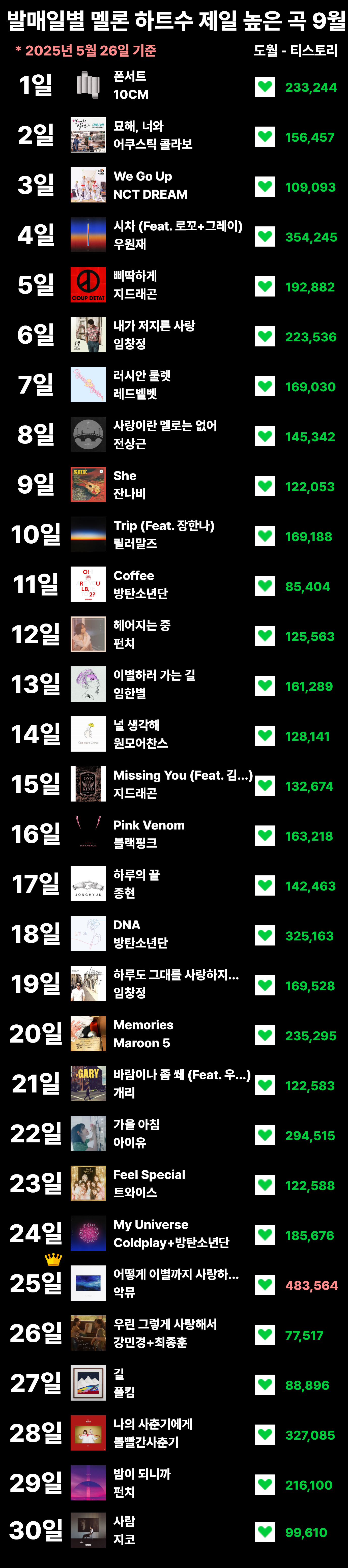발매일별 멜론 하트수 제일 높은 곡 9월편 #악뮤(AKMU) #우원재(WooWonJae) #로꼬(LOCO) #그레이(GRAY) #볼빨간사춘기(BOL4) 음악/멜론 2025.10.07