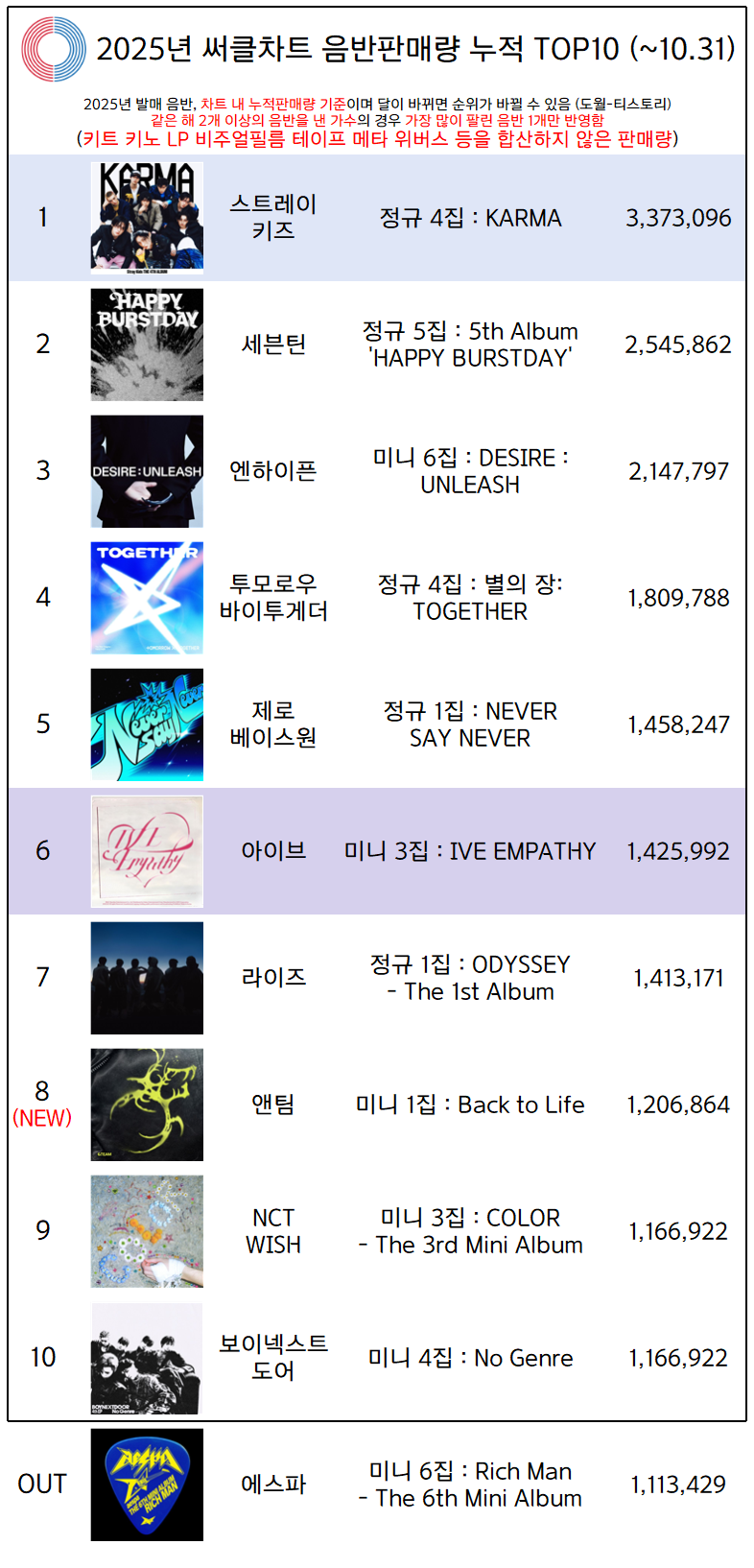 2025년 써클차트 음반판매량 누적 TOP10 (~10.31) #스트레이키즈(StrayKids) #스키즈(SKZ) #세븐틴(SEVENTEEN)#엔하이픈(ENHYPEN) #아이브(IVE) #앤팀(&TEAM) 음악/음반 2025.11.11