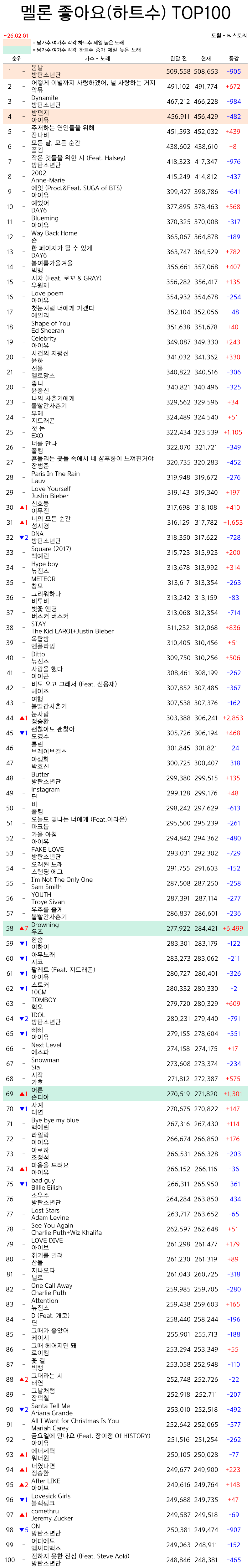 멜론 하트수 TOP100 26년 2월 #방탄소년단(BTS) #악동뮤지션 #악뮤(AKMU) #아이유(IU) #우즈(WOODZ) #조승연 #손디아(Sondia) 음악/멜론 2026.02.18