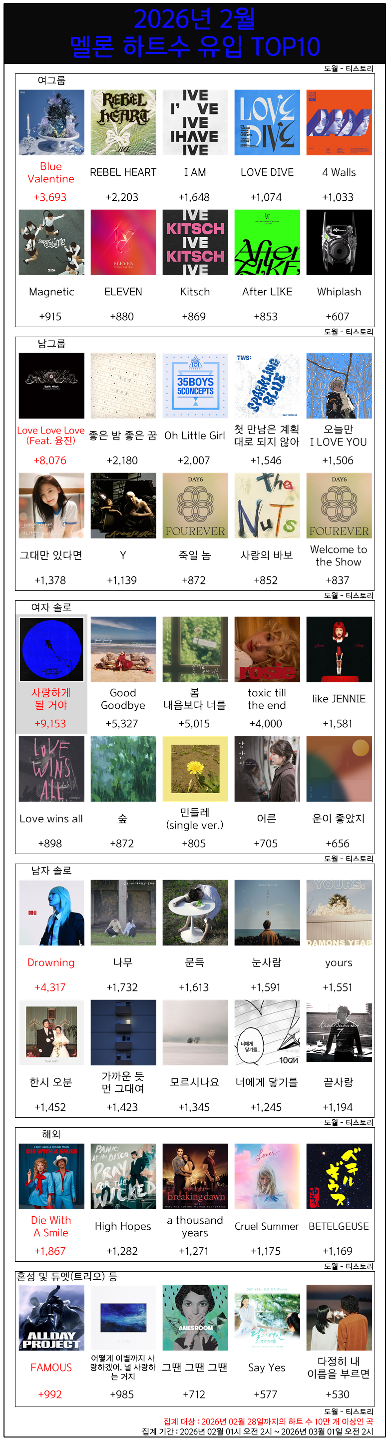 2026년 2월 멜론 하트수 유입 TOP10 #엔믹스(NMIXX) #아이브(IVE) #에픽하이(EPIKHIGH) #너드커넥션(NerdConnection) #한로로(HANRORO) #마마무(Mamamoo) #화사(HWASA) #우즈(WOODZ) #조승연 #카더가든(Carthegarden) #레이디가가(LadyGaga) #브루노마스(BrunoMars) #패닉앳더디스코(Panic!AtTheDisco) #올데이프로젝트(ALLDAYPROJECT) #악뮤(AKMU) 음악/멜론 2026.03.06